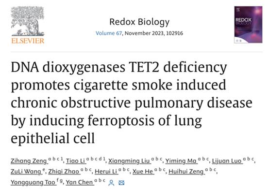 近日,中南大学湘雅二医院呼吸与危重症医学科陈燕团队在国际权威期刊《Redox Biology》(JCR1区,IF=11.4)以Research Article形式发表题为“DNA dioxygenases TET2 deficiency promotes cigarette smoke induced chronic obstructive pulmonary disease by inducing ferroptosis of lung epithelial cell”的原创研究论文。该研究通过体内外实验首次揭示表观遗传明星调控分子TET2在气道上皮细胞中的抗铁死亡作用,并通过动物实验证实了表观遗传疗法协同抗氧化治疗能够显著改善烟草暴露导致的小鼠肺气肿形成等慢阻肺特征性改变,为慢阻肺的精准防治提供了全新思路。