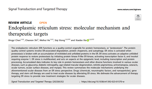 近日,中南大学湘雅医院眼科中心及眼科学湖南省重点实验室夏晓波教授团队的综述“Endoplasmic reticulum stress: molecular mechanism and therapeutic targets ”(内质网应激的分子机制与靶向治疗)在国际权威期刊《Signal Transduction and Targeted Therapy》(《信号转导与靶向治疗》,中科院一区,IF:39.3)上在线发表。该综述系统地阐述了内质网应激在眼科领域疾病中的分子机制,同时讨论了内质网应激作为潜在靶点可通过相关药物、基因治疗、干细胞治疗等来治疗眼科疾病,为眼科疾病治疗提出了新的方向。