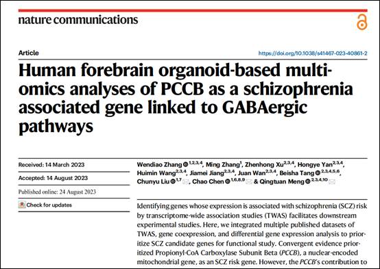 近日,中南大学生命科学学院研究员/中南大学湘雅二医院国家精神疾病医学中心、国家精神心理疾病临床医学研究中心双聘教授陈超团队与中南大学生命科学学院/纽约州立大学上州医科大学刘春宇教授团队、南华大学第一临床学院脑疾病多组学研究中心蒙庆团教授团队合作,在国际权威期刊《自然通讯》(Nature Communications, JCR 1区, IF=16.6)发表题为“Human forebrain organoid-based multi-omics analyses of PCCB as a schizophrenia associated gene linked to GABAergic pathways”的最新研究成果。研究团队通过整合多个已发表的TWAS、基因共表达和差异基因表达分析的数据集,发现一个可靠的精神分裂症风险基因:丙酰辅酶A羧化酶亚基β(PCCB)。该研究利用基于人脑类器官的多组学分析,揭示了PCCB下调可能通过调节GABA能通路和线粒体功能导致精神分裂症的发病风险,并将精神分裂症的“线粒体假说”和“GABA假说”联系起来,为理解精神分裂症的发病机制提供了依据。