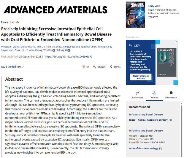 近日,湘雅药学院艾可龙教授和湘雅医院老年外科吴畏教授与药学部黄琼副教授团队,在炎症性肠病(IBD)治疗领域取得重要进展,以“Precisely Inhibiting Excessive Intestinal Epithelial Cell Apoptosis to Efficiently Treat Inflammatory Bowel Disease with Oral Pifithrin-α Embedded Nanomedicine (OPEN)”为题发表在国际权威学术期刊《Advanced Materials》(Q1区,IF=29.4)。IBD是一种慢性和非特异性的炎症性肠道疾病,越来越成为一种巨大且持续增长的医疗负担。P53是各种应激因子的主要中枢,是决定细胞命运的核心因素。在IBD中,肠上皮细胞(IEC)凋亡主要由p53过表达和激活诱导。团队率先开发了一种口服pifithrin-α(PFTα,一种高度特异性的p53抑制剂)嵌入纳米药物(OPEN),通过靶向抑制过度的IEC凋亡来有效治疗IBD。本研究从逆转IEC过度凋亡的角度为IBD的高效治疗提供了新的范式,为IBD的临床治疗带来了巨大的希望。
