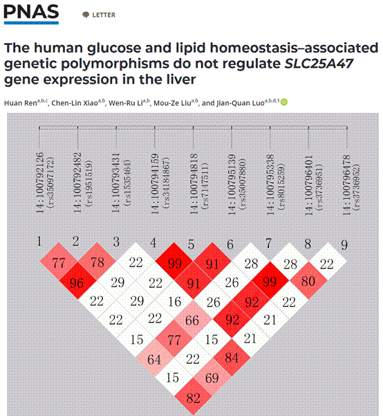 近日,中南大学湘雅二医院药学部青年药师罗建权在国际权威期刊《PNAS》(JCR1区,IF=11.1)发表题为“The human glucose and lipid homeostasis–associated genetic polymorphisms do not regulate SLC25A47 gene expression in the liver”的研究信件。近年来,全基因组关联研究(Genome-wide association studies, GWAS)为阐明复杂性状的遗传结构,建立性状之间的因果关联以及鉴定潜在的治疗靶点提供了大量证据。GWAS数据成功筛选出9个与空腹血糖、糖化血红蛋白和胆固醇水平密切关联的SLC25A47遗传变异。但是,迄今尚不清楚这些遗传变异是否能够调控SLC25A47基因表达,进而影响糖脂代谢。为了验证这一假说,该研究分析了这些遗传变异与SLC25A47基因表达调控数据(17382份RNA-seq数据)。结果发现,SLC25A47基因rs1535464, rs35097172, rs1951519, rs3736952, rs8015259,以及rs34184867, rs35007880, rs3736951,rs7147511处于高度强连锁状态,且在肝脏中不与SLC25A47的表达存在显著关联,这些数据为SLC25A47基因及其遗传变异在糖脂代谢中的作用和机制提供了新的思路及证据。