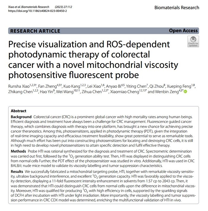 近日,中南大学湘雅医院普外科、胃肠道肿瘤精准诊疗湖南省重点实验室、国家老年疾病临床医学研究中心(湘雅医院)陈子华教授团队与中南大学湘雅药学院、湖南省慢性病诊疗药物研究重点实验室曾文彬教授团队合作,以论著形式在国际权威期刊《Biomaterials Research》(《生物材料研究》,JCR Q1,IF=11.3)上发表了题为“Precise visualization and ROS-dependent photodynamic therapy of colorectal cancer with a novel mitochondrial viscosity photosensitive fluorescent probe”(一种用于结直肠癌精准可视化及ROS依赖性光动力学治疗的新型线粒体粘度光敏荧光探针)的最新研究成果。该原创性研究以精准杀伤肿瘤细胞的需求为导向,针对肿瘤细胞线粒体膜的高粘度特征,将具有线粒体电荷靶向性的粘度敏感荧光分子与ROS(单线态氧,1O2)依赖的光动力治疗原理巧妙地结合,设计了一种具有高粘度敏感性、低生物毒性的多功能HTI荧光探针。在模型验证中实现了肿瘤可视化,并通过可控地激发线粒体HTI聚集区域ROS过量生成,以脂质过氧化损伤的方式,破坏细胞磷脂膜结构,有效地使结肠癌细胞失活。成功在CRC-CDX模型上,采取光动力学治疗方案,验证了HTI对瘤体生长的抑制能力。课题成果从多角度展示了HTI荧光探针的抗肿瘤前景,具有应用转化的价值,为CRC的可视化筛查、辅助光动力学治疗提供了新颖的思路。有望在临床实践中,助力医疗工作者高效地诊断与治疗,优化CRC的疾病管理流程,最终使患者收获更良好的预后。