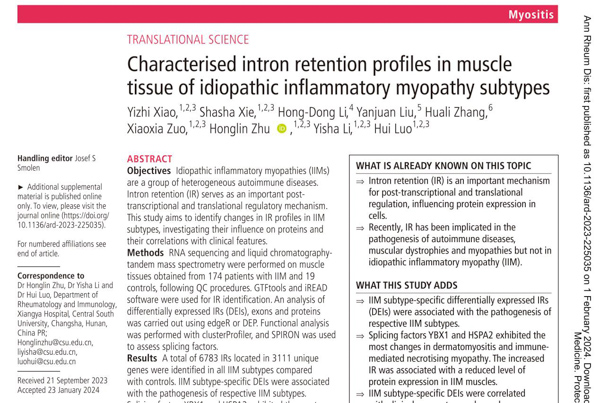 近日,中南大学湘雅医院风湿免疫科罗卉教授团队在《Annals of the Rheumatic Diseases(风湿病年鉴)》杂志(风湿免疫病学领域最有影响力的顶级刊物,IF=27.4) 发表题为《Characterised intron retention profiles in muscle tissue of idiopathic inflammatory myopathy subtypes(各类亚型的特发性炎性肌病肌肉组织中内含子保留的特征分析)》的原创性研究。