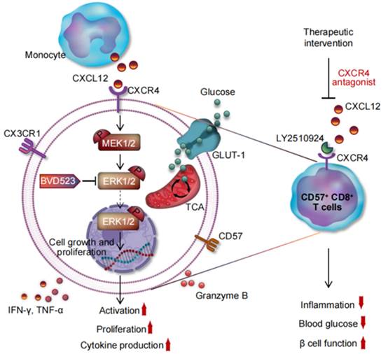 通过功能实验分析,课题组发现CD57+ CD8+ T细胞是一群高杀伤、糖代谢活跃的T细胞亚群;CXCL12-CXCR4轴通过Erk1/2信号通路可促进该细胞亚群的扩增和功能。体内动物实验进一步证明,CXCR4拮抗剂LY2510924可以缓解链脲佐菌素(STZ)诱导的糖尿病小鼠模型的高血糖症状、减少CD57+ CD8+ T细胞的免疫浸润,有助于延缓疾病的进展。该研究揭示了CXCL12-CXCR4轴在T1D中调控CD57+ CD8+ T细胞应答的新机制,并提出了一种潜在的治疗策略,用于延缓T1D的发病和进展。