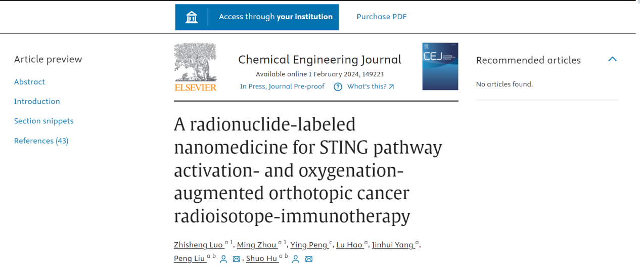 近日,中南大学湘雅医院核医学科(PET中心)胡硕教授团队在《Chemical Engineering Journal》杂志(工程技术与化学化工领域最有影响力的三大顶级刊物之一,IF=15.1) 发表题为《A Radionuclide-labeled Nanomedicine for STING Pathway Activation- and Oxygenation-augmented Orthotopic Cancer Radioisotope-immunotherapy》的原创性研究。