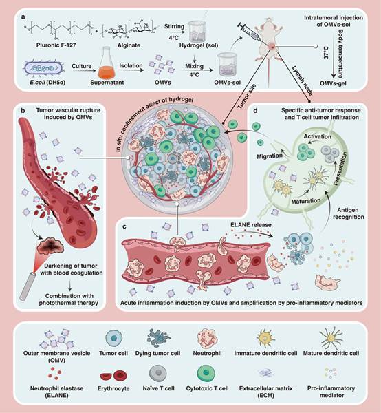 肿瘤慢性炎症是肿瘤免疫抑制微环境的关键推动因素,可促进肿瘤生长、转移、血管生成和耐药,克服肿瘤慢性炎症可有效逆转肿瘤的免疫抑制状态。目前临床使用的抗炎药物易耐药,而促炎疗法则响应率低、成本高。基于此,向大雄教授团队开发了一种适用性广、响应率高的新型肿瘤急性炎症诱导剂,将来源于大肠杆菌DH5α的外膜囊泡(OMVs)包载于温度敏感型水凝胶中,局部注射至肿瘤部位,实现原位释放OMVs,避免了全身毒性。OMVs诱导的肿瘤急性炎症招募大量中性粒细胞,释放弹性蛋白酶,选择性杀死肿瘤细胞,降解肿瘤基质;中性粒细胞分泌的大量促炎介质可放大急性炎症,并促进肿瘤相关巨噬细胞的极化;同时,OMVs致使肿瘤血管破裂,外观变黑,从而联用光热疗法进一步根除肿瘤。该免疫制剂在多种实体肿瘤模型中的有效性均得到了验证,是具有广阔转化前景的新型免疫制剂。