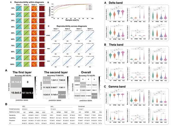 该研究发现,通过一种基于静息态脑电图(EEG)的动态功能连接(DFC)方法,可以在个体水平上可靠地检测精神分裂症(SCZ)、伴精神病性症状的重度抑郁发作(PMD),不伴精神病性症状的重度抑郁发作(NPMD)和健康人群(HC)四种群体大脑状态的动态网络特性,确定的关键动态网络指标在HC、NPMD、PMD和SCZ的四种分类中达到73.1±2.8%的准确率,明显优于静态功能连接(SFC)方法,且这些关键动态网络指标可能是是精神疾病的潜在表型。最后,我们发现基于DFC的生物标志物通过机器学习方法在精神疾病的预筛选和临床诊断中是有效的,这些生物标记物有可能在精神疾病或健康对照的不同诊断组中帮助准确区分。这项工作可能有助于开发一种有价值的基于脑电图的诊断工具,帮助区分和辅助诊断精神疾病。