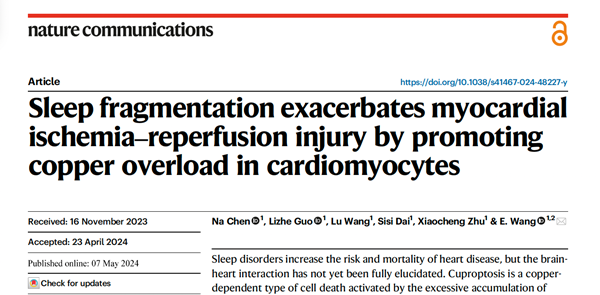 近日,中南大学湘雅医院麻醉手术部主任王锷教授团队在国际著名综合类期刊《Nature Commsunications(自然通讯)》(中科院一区Top期刊,lF=16.6)以论著形式发表了题为“Sleep fragmentation exacerbatesmyocardialischemia‒reperfusion injury by promotingcopper overload in cardiomyocytes(睡眠碎片化通过促进心肌细胞中的铜超载加剧心肌缺血再灌注损伤)”的原创性研究论文。