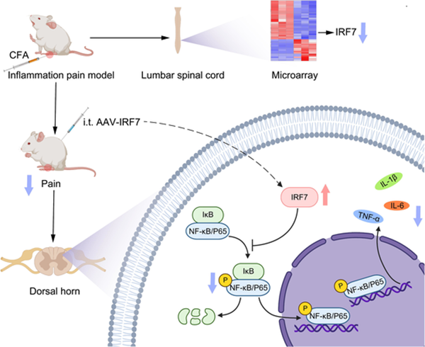 近日,中南大学湘雅医院麻醉手术部邹望远教授/罗剑刚主治医师团队,在慢性疼痛领域取得的重要研究成果“IRF7 overexpression alleviates CFA-induced inflammatory pain by inhibiting nuclear factor-κB activation and pro-inflammatory cytokines expression in rats(过表达IRF7可通过抑制核因子-κB的活化和促炎细胞因子的表达减轻完全弗氏佐剂所致的大鼠炎性疼痛)”在神经科学期刊《Brain, Behavior, and Immunity(大脑、行为与免疫)》(IF:15.1)以“原创论著”形式在线发表。中南大学湘雅医院麻醉手术部邹望远教授和罗剑刚主治医师为论文共同通讯作者,蒋莎莎硕士、李正弈棋博士生和黄思渐主治医师为论文共同第一作者,中南大学湘雅医院麻醉手术部为第一作者和第一通讯作者单位。