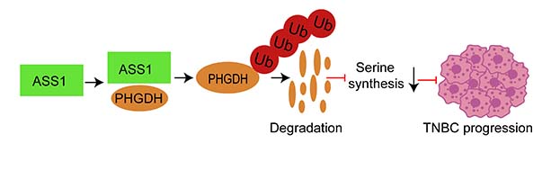 近日,《细胞死亡与疾病》(Cell Death & Disease)在线发表了中南大学生命科学学院罗志勇教授研究团队发现并揭示ASS1抑癌新机制的最新成果。该研究论文题为“ASS1通过调节PHGDH的稳定性和丝氨酸的从头合成抑制三阴性乳腺癌的进展(ASS1 inhibits triple-negative breast cancer by regulating PHGDH stability and de novo serine synthesis)”。该研究率先发现抑癌蛋白ASS1的首个直接互作蛋白磷酸甘油酸脱氢酶(PHGDH),该蛋白为丝氨酸从头合成途径的第一个催化反应且是唯一的限速酶,ASS1通过诱发PHGDH泛素化降解导致丝氨酸合成受阻,进而抑制三阴性乳腺癌的生长。