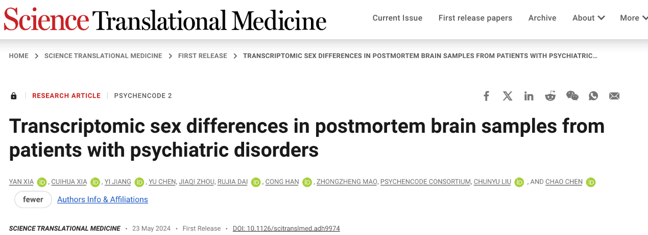 陈超作为共同通讯作者在《科学转化医学》(Science Translational Medicine)杂志上在线发表题为“精神障碍患者死后大脑样本的转录组性别差异(Transcriptomic sex differences in postmortem brain samples from patients with psychiatric disorders)”的研究论文。该研究分析了来自PsychENCODE联盟的2160例精神分裂症(SCZ)、双相情感障碍(BD)、孤独症谱系障碍(ASD)患者的死后成人大脑样本的转录组学数据。单个基因水平发现女性精神疾病患者的基因表达改变普遍大于男性患者,基因共表达网络水平上发现女性SCZ、BD和ASD相对于男性患者有更高比例的共表达模块呈现出明显的连接度改变,女性的转录组负担中与免疫和神经突触相关通路的基因(如SCN2A、FGF14和C3)比男性更加富集。该研究不仅在精神障碍的背景下解释了男性和女性在转录组功能障碍上的差异,而且将免疫和突触相关通路与这些性别差异联系起来,增加了性别影响精神障碍机制的理解。