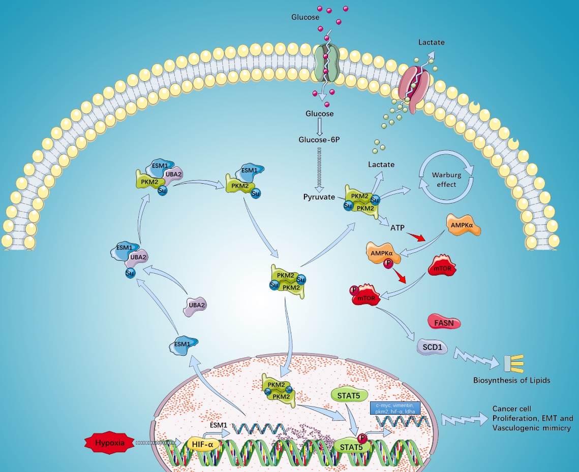 该研究结果表明,缺氧通过HIF-1α的转录诱导ESM1表达上调。ESM1是PKM2和UBA2相互作用的重要中介,促进PKM2的SUMOylation修饰和二聚体的形成。这一过程促进PKM2的核易位并磷酸化STAT3。这些分子事件有助于促进OC Warburg效应和VM。此外,研究发现,紫草素可以有效抑制ESM1和PKM2之间的相互作用,阻止PKM2二聚体的形成,从而抑制OC的Warburg效应、脂肪酸合成和VM。综上,缺氧通过HIF-1α的转录调控增加ESM1的表达,促进PKM2 SUMOylation修饰诱导二聚化,从而诱导OC Warburg效应和VM。
