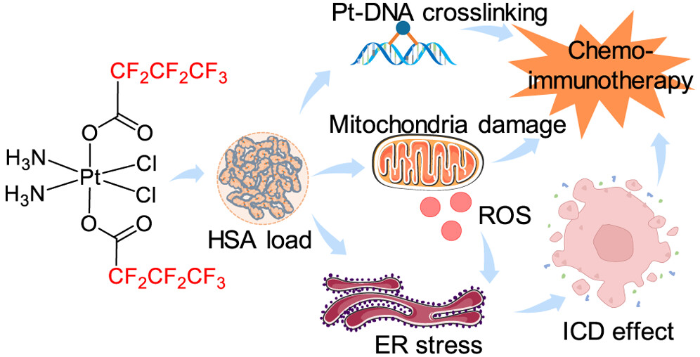 作者通过用全氟碳链对顺铂进行轴向改性,制备了一种铂(IV)前药,得到了意想不到的免疫原性细胞死亡(ICD)诱导效果,从而解决了传统化疗铂药的一个关键限制。经过一系列的研究探索发现该铂(IV)前药是由于其在内质网中积累并产生活性氧化物从而诱导肿瘤细胞产生ICD效应。随后作者使用人血清白蛋白将铂(IV)前药封装成纳米粒子,增强了其药理学特性,使其能够选择性地积累在肿瘤组织中,并在小鼠肿瘤模型中观察到了对骨肉瘤的强烈抑制效果。总的来说,这项研究展示了白蛋白包裹的轴向全氟碳链改性的铂(IV)前药作为一种化疗-免疫联合疗法在骨肉瘤和可能其他类型癌症治疗中的潜力。