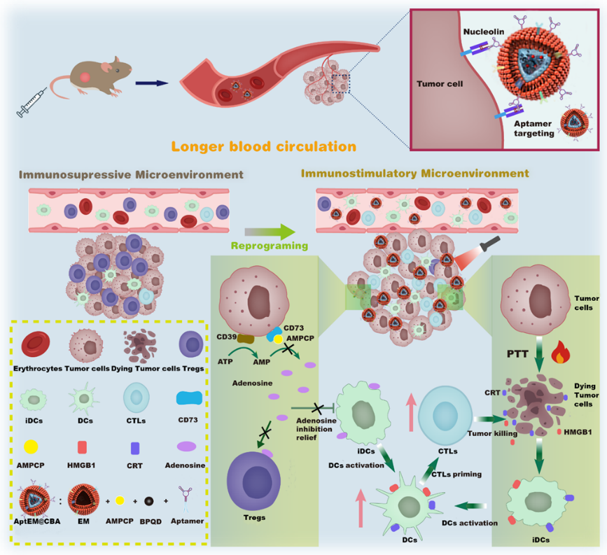 肿瘤免疫治疗面临响应率较低的问题,由三磷酸腺苷(ATP)经细胞表面蛋白CD73分解生成的腺苷是一种重要的免疫抑制因子,对免疫细胞的抗肿瘤活性产生强的抑制效应,通过抑制CD73阻断腺苷的产生可以促进抗肿瘤免疫反应。光热治疗(PTT)是通过光热效应杀伤肿瘤细胞,同时诱导肿瘤细胞的免疫原性细胞死亡(ICD),引发死亡肿瘤细胞释放损伤相关分子模式(DAMPs),可以有效地促进免疫响应。基于上述原理,赵岳涛课题组将CD73抑制剂5′ -(α,β-亚甲基)二磷酸-腺苷(AMPCP)和光热剂黑磷量子点(BPQDs)封装在壳聚糖纳米凝胶中,并在壳聚糖纳米凝胶表面包覆了肿瘤靶向性适体AS1411修饰的红细胞膜(EM),成功构建了具有腺苷调控功能的仿生光热免疫纳米药物AptEM@CBA。通过AS1411引导下的主动靶向和EM赋予的长血液循环时间,促进了纳米药物在肿瘤位点的富集。光热治疗可促进免疫激活,同时,通过释放AMPCP阻断CD73的腺苷生成途径,减轻腺苷对树突状细胞的功能损伤,并抑制调节性T细胞(Tregs)、髓源性抑制细胞(MDSC)、M2型肿瘤相关巨噬细胞(TAMs)的功能,从而协同刺激T细胞活性。CD73阻断与PTT的结合,不仅能抑制原发性植入肿瘤的生长,还激发了有效的抗肿瘤免疫响应,抑制远端肿瘤的生长。