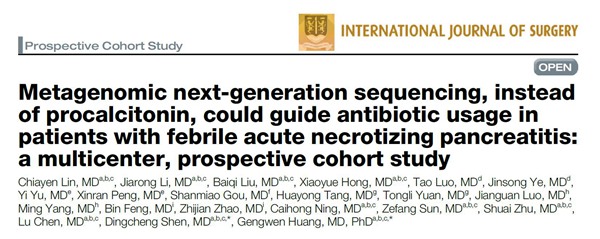 近日,黄耿文教授团队这一重要的临床研究论著“Metagenomic next-generation sequencing, instead of procalcitonin, could guide antibiotic usage in patients with febrile acute necrotizing pancreatitis : a multicenter, prospective cohort study”(宏基因组二代测序而非降钙素原可用于指导有发热症状的急性坏死性胰腺炎患者的抗生素使用:一项多中心、前瞻性队列研究),在外科学顶级期刊《International Journal of Surgery》(国际外科学杂志,Q1,IF= 15.3)上发表。
