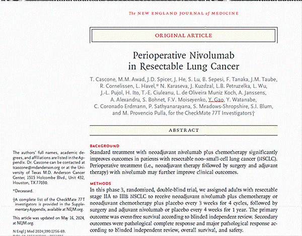 近日,四大顶级医学期刊之一《N Engl J Med》(《新英格兰医学杂志》,IF=158.5)发表了国际多中心大型临床试验CheckMate 77T(一项在可切除的II-IIIB期非小细胞肺癌受试者中进行的新辅助化疗+纳武利尤单抗与新辅助化疗+安慰剂治疗,继以进行手术切除和纳武利尤单抗或安慰剂辅助治疗的III期、随机、双盲研究)的研究结果。湘雅医院胸外科高阳教授团队深度参与了该研究,并受邀成为该论文的共同作者。