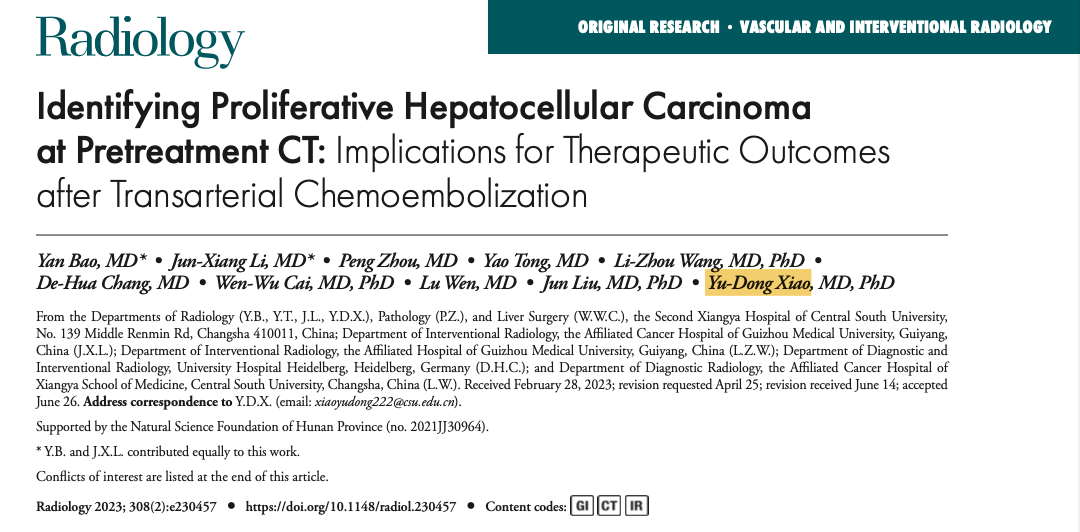 近日,中南大学湘雅二医院放射科肖煜东副研究员课题组在放射学顶级期刊《Radiology》(中科院1区,Top 1,IF=19.7)在线发表了题为“Identifying Proliferative Hepatocellular Carcinoma at Pretreatment CT: Implications for Therapeutic Outcomes after Transarterial Chemoembolization”的研究论文。
