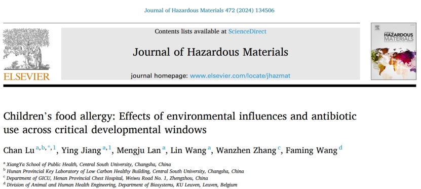 近日,湘雅公共卫生学院劳动卫生与环境卫生系路婵教授团队的研究成果“Children's food allergy: Effects of environmental influences and antibiotic use across critical developmental windows”在国际环境健康领域权威期刊Journal of Hazardous Materials(IF:13.6,JCR Top 5%,中科院1区TOP)以Research Paper发表。