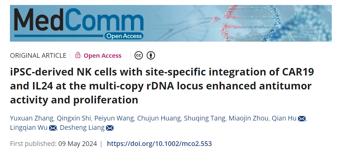 近日,中南大学生命科学学院医学遗传学研究中心梁德生教授团队在国际高质量学术期刊《MedComm》上发表了嵌合抗原受体(CAR)-NK细胞治疗研究的最新进展,文章题为“iPSC-derived NK cells with site-specific integration of CAR19 and IL24 at the multi-copy rDNA locus enhanced antitumor activity and proliferation”(在多拷贝rDNA位点定点整合CAR19和IL24的iPSCs衍生NK细胞增强了抗肿瘤活性和增殖能力)。