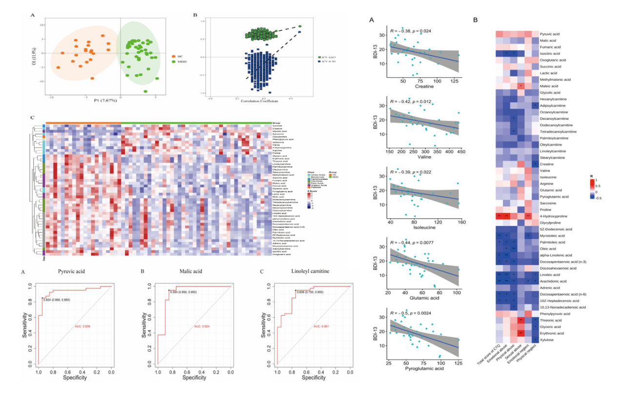 该研究发现,基于UPLC-MS /MS的靶向代谢组学分析,青少年抑郁症患者中的48种代谢物与健康对照有显著差异,这些代谢物涉及能量、氧化应激、氨基酸、脂肪酸和脂质代谢。另外,还发现丙酮酸(pyruvate)、苹果酸(malic acid)和亚油基肉碱 (linoleylcarnitine)是诊断青少年MDD的潜在生物标志物。最后,我们还发现抑郁症状与肌酸和部分氨基酸呈负相关,童年期虐待与部分脂肪酸、异柠檬酸和酰基肉碱呈负相关,与4-羟脯氨酸呈正相关,这为从生活早期不良环境的远端因素探索青少年症患者的分子机制提供了证据。这项研究为青少年重度抑郁症的发病机制和治疗提供了新的思路,有助于提高对青少年MDD发病机制的认识,帮助诊断和治疗。