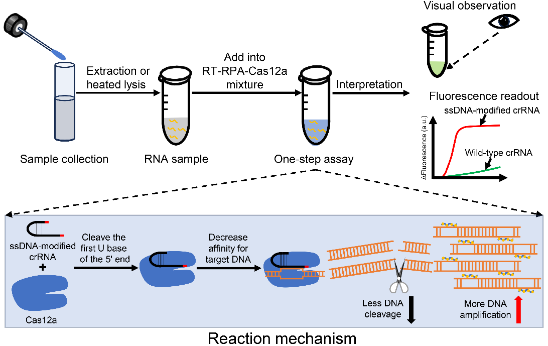 本研究中,梁德生教授团队深入探索单链DNA修饰crRNA介导的Cas12a一步法核酸检测的反应机制,并将该方法拓展至RNA病原体的检测。机制研究发现,修饰crRNA在一步法反应中具有更好的检测性能是由于其3’末端添加的DNA减弱了Cas12a-修饰crRNA复合物与目标DNA的亲和力,导致Cas12a顺式、反式剪切活性的降低,这种改变使得Cas12a减少了对目标DNA的剪切,一步法反应有更多的目标DNA得以扩增和积累,最终提升了检测能力。此外,通过对检测体系的全方位优化,研究人员成功将该方法应用于新冠病毒的特异性检测,灵敏度达到5 aM,并可在紫外灯下可视化观察结果。临床标本试验中,该方法检测40例新冠病毒标本与荧光定量PCR的结果一致性为97.5%。