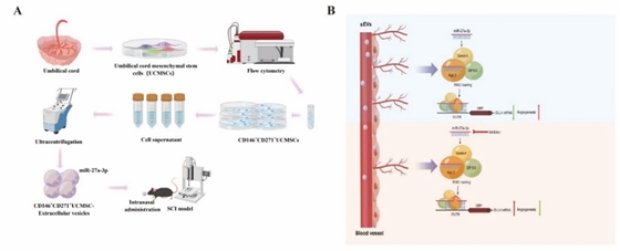 胡建中和吕红斌教授团队一直聚焦于脊髓损伤治疗的研究。通过流式分选,获得具有血管生成优势的CD146+CD271+脐带间充质干细胞亚群,提取其sEVs。小动物活体示踪结果显示,鼻内递送的CD146+CD271+UCMSC-sEVs可有效到达小鼠脊髓损伤处,并能显著促进脊髓损伤后小鼠血管生成和运动功能恢复;通过microRNA阵列分析,发现CD146+CD271+UCMSC-sEVs中存在多种microRNA富集,而miR-27a-3p是介导CD146+CD271+UCMSC-sEVs发挥促血管生成功能的关键分子。进一步机制研究发现,CD146+CD271+UCMSC-sEVs的miR-27a-3p通过抑制DLL4的表达,在体外增强bEnd.3细胞的迁移和成管形成,同时在体内调控血管生成。本研究结果证实,CD146+CD271+UCMSC-sEVs通过miR-27a-3p/DLL4轴调控血管生成,鼻内递送CD146+CD271+UCMSC-sEVs可作为治疗脊髓损伤的一种富有前景的方式。