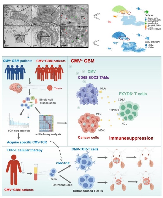 近日,基础医学院武明花/刘庆/陈帅/杜鹏合作团队在《Journal for ImmunoTherapy of Cancer》(IF=10.9)在线发布了题为“ScRNA-seq reveals novel immune-suppressive T cells and investigates CMV-TCR-T cells cytotoxicity against GBM”的研究论文。该研究首次揭示了CMV感染的GBM肿瘤微环境的细胞图谱,明确了在GBM中存在一群新的免疫抑制性T细胞,并评估了靶向CMV的TCR-T细胞疗法对GBM生长的抑制效应。