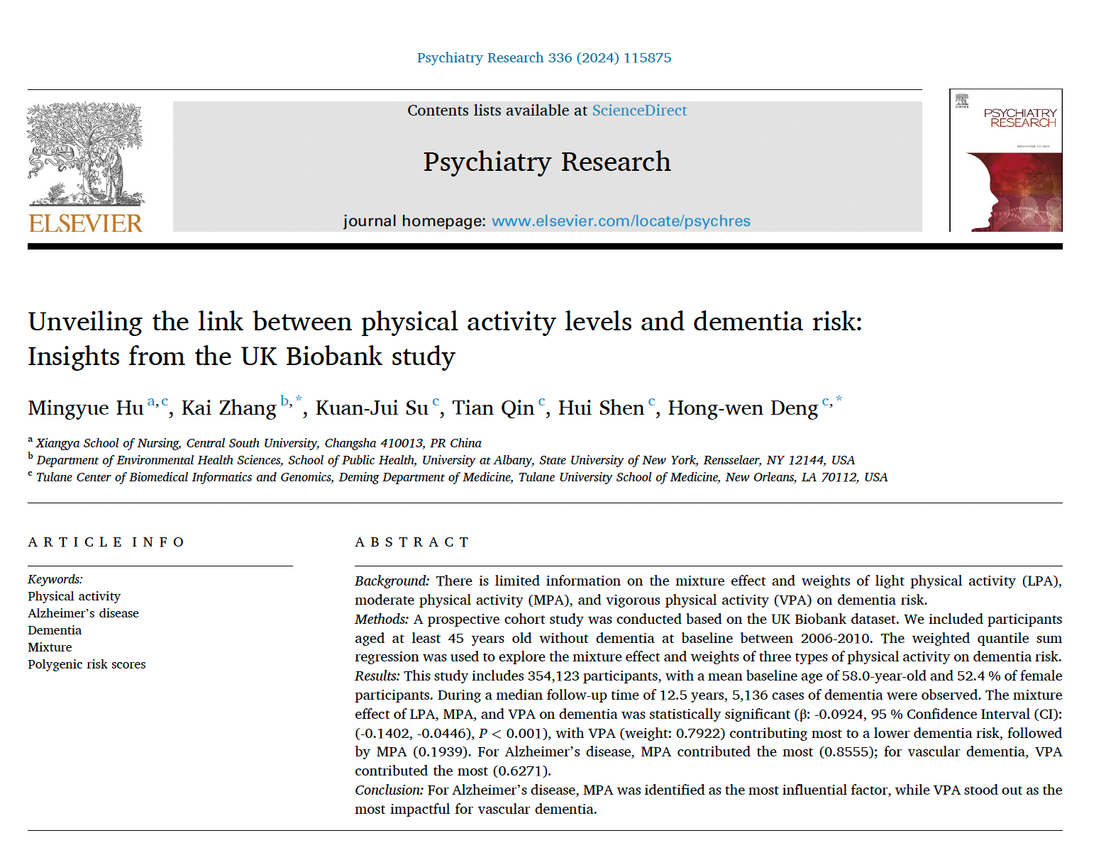 近日,湘雅护理学院胡明月讲师与杜兰大学邓红文教授、张楷团队合作,通过UK biobank在《Psychiatry Research》(IF=11.3)杂志发表原创研究“Unveiling the link between physical activity levels and dementia risk: Insights from the UK Biobank study”。该研究揭示三种体力活动(Physical activity, PA),即轻度LPA、中度MPA和重度VPA对痴呆发生影响中的混合权重和痴呆亚型权重。具体地,通过对354,123名45岁及以上的中老年人长达约12.5年的痴呆事件跟踪,发现了VPA对降低痴呆发生权重最高(weight: 0.7922),MPA(weight: 0.1939)排次。在痴呆亚型权重中,MPA对阿尔茨海默氏症AD影响最强;VPA对血管性痴呆VaD最强。研究对认知障碍精准和高效干预提供新思路。