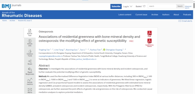 近日,中南大学基础医学院免疫学系谭婷婷副教授与湘雅二医院骨科欧阳正晓、华中科技大学公共卫生学院田耀华团队合作,在国际权威期刊Annals of Rheumatic Disease(IF:27.4)发表题为“Associations of residential greenness with bone mineral density and osteoporosis: the modifying effect of genetic susceptibility”的研究论文。