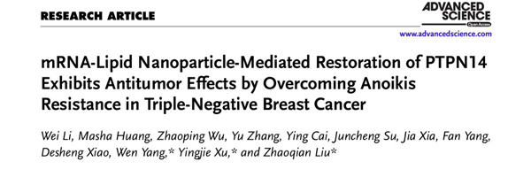 近日,中南大学湘雅医院临床药理研究所刘昭前教授团队在国际著名期刊《Advanced Science》(中科院1区,IF:15.1)发表原创学术论文“mRNA-Lipid Nanoparticle-Mediated Restoration of PTPN14 Exhibits Antitumor Effects by Overcoming Anoikis Resistance in Triple-Negative Breast Cancer”(“在三阴性乳腺癌中,mRNA-脂质纳米颗粒介导的PTPN14回补通过克服失巢凋亡抵抗表现出抗肿瘤作用”)。该研究通过全基因组CRISPR/Cas9敲除筛选,确定了PTPN14是三阴性乳腺癌(TNBC)失巢凋亡抵抗的关键调节因子。过表达PTPN14通过去磷酸化BCAR3,影响PI3K/AKT和ERK通路,抑制TNBC细胞的失巢凋亡抵抗、成瘤和转移。在小鼠模型中,PTPN14 mRNA-脂质纳米颗粒(LNPs)的瘤内递送抑制了肿瘤的生长和转移,突出了其治疗潜力。