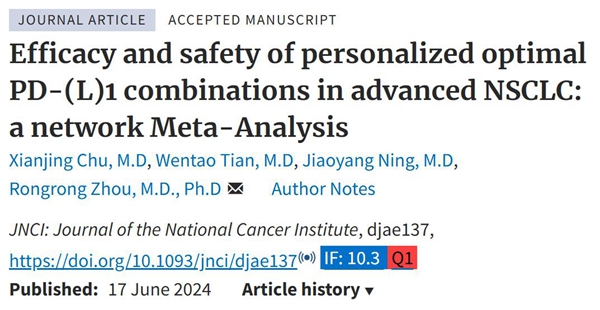 近日,中南大学湘雅医院肿瘤科周蓉蓉教授团队在国际知名期刊《Journal of the National Cancer Institute》(IF=10.3,中科院1区TOP期刊)上在线发表了晚期非小细胞肺癌领域的重要研究成果“Efficacy and safety of personalized optimal PD-(L)1 combinations in advanced NSCLC: a network Meta-Analysis”(晚期非小细胞肺癌中个体化最佳PD-(L)1联合治疗的有效性和安全性:网状Meta分析)。