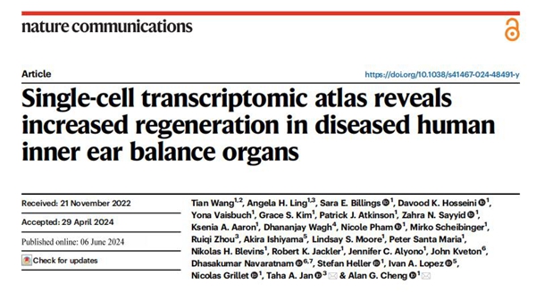 近日,中南大学湘雅二医院耳鼻咽喉头颈外科王恬教授团队在权威期刊《Nature communications》(IF:16.6)上发表了题为“Single-cell transcriptomic atlas reveals increased regeneration in diseased human inner ear balance organs”的原创性研究论文。该文首次报道了人类前庭毛细胞的单细胞测序图谱,并发现了毛细胞再生的相关通路。