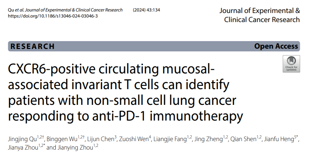 近日,由谈球吧附属肿瘤医衡建福助理研究员作为通讯作者在《J Exp Clin Cancer Res》(中科院一区,,IF=11.5)发表了题为“CXCR6-positive circulating mucosal-associated invariant T cells can identify patients with non-small cell lung cancer responding to anti-PD-1 immunotherapy (CXCR6阳性的MAIT细胞可以区分非小细胞肺癌患者抗PD-1免疫治疗是否敏感)”的原创性研究论文。