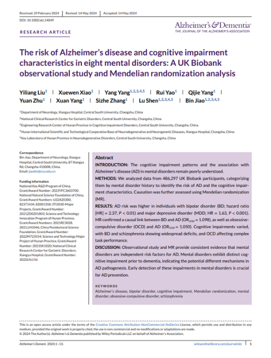 近日,中南大学湘雅医院神经内科、国家老年疾病临床医学研究中心(湘雅医院)沈璐教授、焦彬副研究员团队在神经病学领域顶级期刊《Alzheimer’s & Dementia》(阿尔茨海默病与痴呆,IF=14.0)以论著形式在线发表了题为“The risk of Alzheimer’s disease and cognitive impairment characteristics in eight mental disorders: a UK Biobank observational study and Mendelian randomization analysis”(8种精神疾病与阿尔茨海默病风险及认知域受损的关联:一项基于英国生物银行的观察性研究和孟德尔随机化分析)的最新研究成果。该研究首次联合真实世界数据和孟德尔随机化因果推断方法,发现了双相情感障碍与阿尔茨海默病风险增加存在关联,并揭示了精神分裂症、双相情感障碍和强迫症谱系障碍等精神疾病在不同认知域的特征性受损。