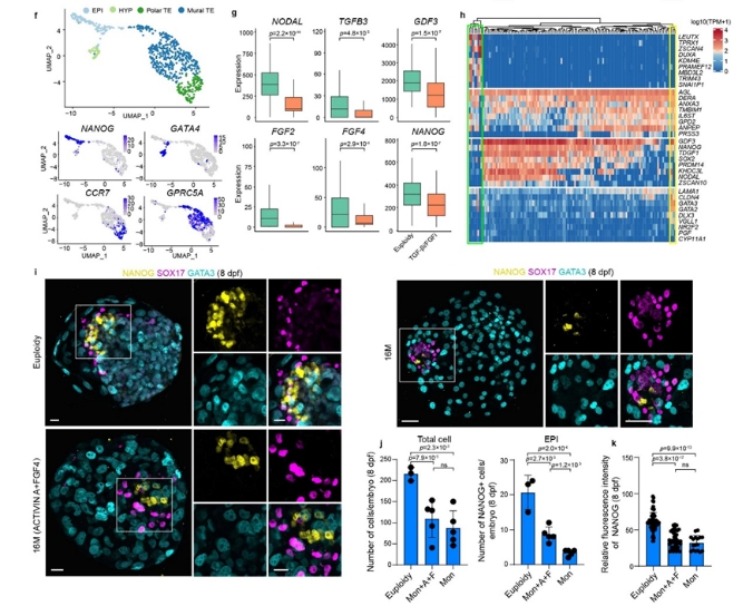 染色体非整倍性是人类早期胚胎发育阻滞、流产和出生缺陷的主要原因。然而,非整倍体导致人类早期胚胎发育潜能下降的分子机制还不清楚。林戈课题组基于植入前遗传学检测结果筛选出覆盖1-22号常染色体及性染色体的非整倍体囊胚,总共检测了203枚囊胚,共计14908个细胞的单细胞转录组,揭示了全染色体组非整倍体囊胚的剂量效应规律,发现基因的转录水平与染色体拷贝数成正比。通过差异基因分析识别出每条染色体上的剂量效应基因和剂量补偿基因,并鉴定出90个剂量敏感的区域。课题组还发现上胚层(Epiblast, EPI)是囊胚发育的调整中心,通过分泌TGF-β和FGF信号通路相关因子介导胚内及胚外谱系细胞的命运,并且TGF-β和FGF信号通路活性下降是非整倍体胚胎EPI发育异质性和滋养外胚层(Trophectoderm,TE)成熟不足的重要原因。该研究从全染色体组水平解析了人类早期胚胎染色体倍性—基因表达—谱系分化的级联调控网络,为理解染色体剂量效应及对早期胚胎发育的影响奠定了基础。