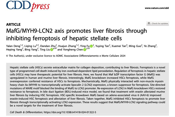 近日,中南大学湘雅医院卫健委肿瘤蛋白质组学重点实验室陈永恒教授团队和消化内科刘霆教授团队,在国际学术权威期刊《Cell Death & Differentiation》(细胞死亡与分化,IF:12.4)上以原创论著形式在线发表了肝纤维化领域取得的重要研究成果“MafG/MYH9-LCN2 axis promotes liver fibrosis through inhibiting ferroptosis of hepatic stellate cells”(MafG/MYH9-LCN2轴通过抑制肝星状细胞铁死亡促进肝纤维化)。