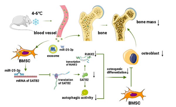 该研究发现血浆来源的细胞外囊泡在寒冷暴露过程中参与骨代谢的调节。寒冷暴露降低了小鼠的骨量和质量。寒冷暴露诱导的血浆来源的细胞外囊泡(CT-EXO)也可通过抑制自噬活性而损害BMSCs的成骨分化,减少骨量。雷帕霉素,一种有效的自噬诱导剂,可以逆转冷暴露或CT-EXO引起的骨丢失。基因芯片测序显示,冷暴露增加了CT-EXO中miR-25-3p的水平。机制研究表明,miR-25-3P可抑制BMSCs的成骨分分化和自噬活性通过靶向SATB2抑制其的表达。抑制小鼠体内外泌体的释放或下调miR-25-3p水平可以抑制CT所致的骨丢失。该研究证实CT-EXO通过miR-25-3p靶向SATB2抑制自噬介导了寒冷暴露诱导的骨质疏松效应,为预防长期处于寒冷环境生活和工作的人群提供新的治疗靶点。本项目受到国家重点研发计划、国家自然科学基金、国家临床重点专科重大科研专项等科研项目的支持。