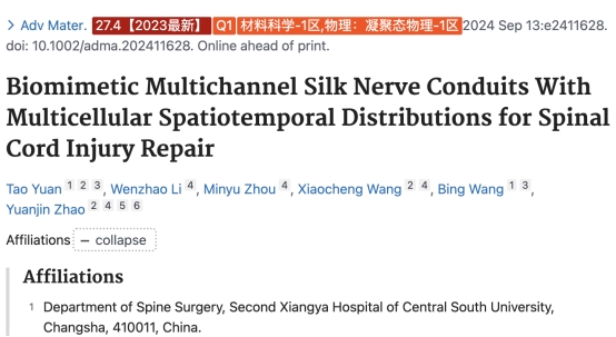 王冰团队在《Advanced Materials》发表原创性丝素神经导管用于治疗脊髓损伤研究成果