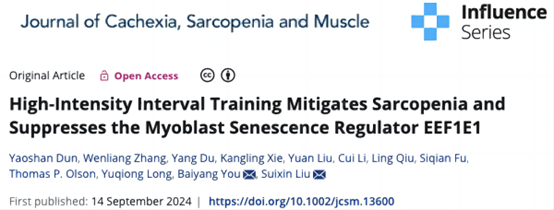 近日,中南大学湘雅医院康复医学科主任刘遂心教授团队围绕高强度间歇运动治疗肌少症的作用及机制,在《Journal of Cachexia, Sarcopenia and Muscle》(恶病质、肌少症和肌肉杂志)(五年平均IF:10.6)以原创论著形式发表了“High-Intensity Interval Training Mitigates Sarcopenia and Suppresses the Myoblast Senescence Regulator EEF1E1”(高强度间歇运动改善肌少症并抑制成肌细胞衰老调节因子EEF1E1)。