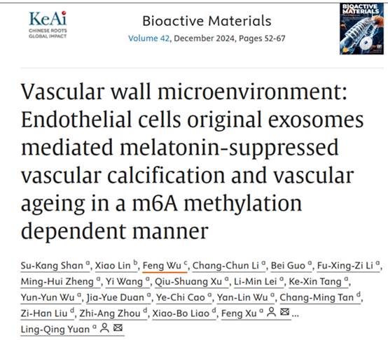 近日,国家代谢性疾病临床医学研究中心、中南大学湘雅二医院代谢内分泌科袁凌青教授团队在国际著名期刊《生物活性材料》(bioactive materials,IF18.0)上在线发表题名为《血管壁微环境:内皮细胞源性外泌体通过m6A依赖方式介导褪黑素抑制血管钙化和衰老》(Vascular wall microenvironment: endothelial cells original exosomes mediated melatonin-suppressed vascular calcification and vascular ageing in a m6A methylation-dependent manner)的重要研究成果。