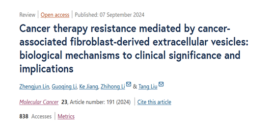 近日,中南大学湘雅二医院骨科、肿瘤模型与个体化诊治研究湖南省重点实验室、人工智能诊疗装备湖南省工程研究中心黎志宏教授团队在《Molecular Cancer》(JCR Q1;中科院一区Top,IF=27.7)发表综述“Cancer therapy resistance mediated by cancer-associated fibroblast-derived extracellular vesicles: biological mechanisms to clinical significance and implications”。癌症相关成纤维细胞(CAFs)是肿瘤微环境中的一个多样化基质细胞群,它们在癌症进展和患者预后中发挥着重要作用。 CAF可通过产生胞外囊泡(EV)、多种分泌因子和代谢产物与癌细胞广泛互动。该文系统总结了CAF衍生的EVs在介导癌症对化疗、靶向治疗药物、放疗和免疫疗法的耐药性方面的生物学作用和详细的分子机制,还讨论了CAF衍生的EVs在癌症临床治疗中作为新靶点和临床生物标志物的治疗潜力,从而为提高癌症疗效和改善患者预后提供一种新的治疗策略。