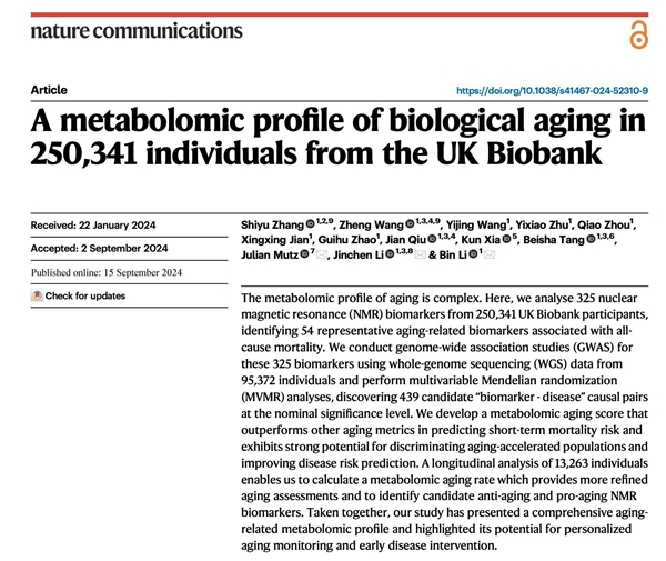 近日,中南大学湘雅医院国家老年疾病临床医学研究中心/生物信息中心李津臣教授、李滨副研究员团队与伦敦国王学院社会、遗传与发育精神病学中心Julian Mutz教授合作在国际著名综合类期刊《Nature Communications(自然通讯)》(中科院一区Top期刊,IF=14.7)以论著形式发表了题为”A metabolomic profile of biological aging in 250,341 individuals from the UK Biobank (基于UK Biobank队列250,341参与者绘制的生物学衰老背后的代谢组全景图谱)“的原创性研究论文。
