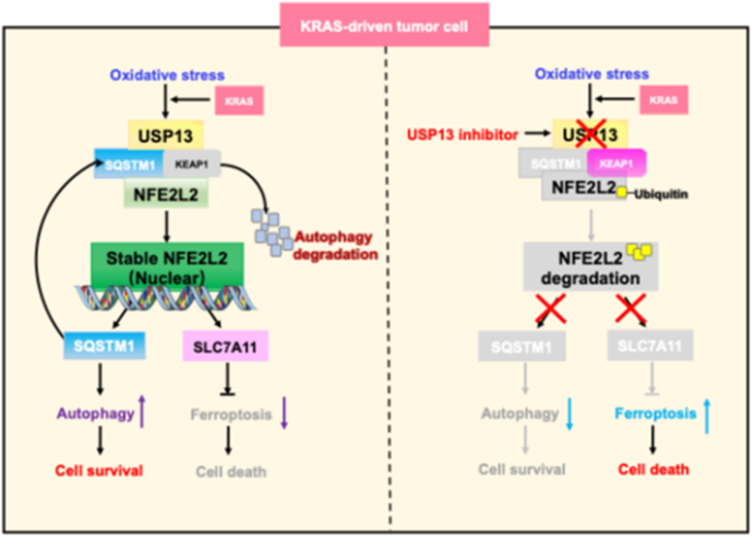 细胞命运之间的相互交流是细胞生命活动的基本特征之一,也是近年研究热和前沿。自噬是溶酶体调控的蛋白质降解过程,参与细胞应激,促进细胞存活或死亡,铁死亡最初被描述为一种不依赖自噬、非凋亡经铁离子调控的细胞死亡,但这两种调节性细胞死亡相互影响的分子机制仍不清楚。本研究揭示了KRAS(肉瘤病毒癌基因)突变的肺腺癌细胞自噬和铁死亡之间的转换机制,强调了去泛素化酶USP13在KRAS突变型肺腺癌铁死亡与自噬转换中的重要性,并表明靶向USP13以促进自噬向铁死亡转换可能是治疗KRAS突变型肺腺癌的潜在策略。