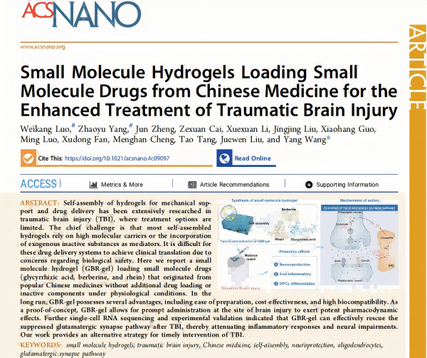 近日,国家中西医协同“旗舰”医院试点项目建设单位—中南大学湘雅医院中西医结合科医工交叉团队原创成果“Small molecule hydrogels loading small molecule drugs from Chinese medicine for enhanced treatment of traumatic brain injury(源自中药的小分子水凝胶负载小分子药物用于改善创伤性脑损伤治疗)”在Nature指数期刊《ACS Nano(美国化学学会·纳米)》(中科院1区Top期刊,IF 15.8)以“原创论著”形式在线发表。