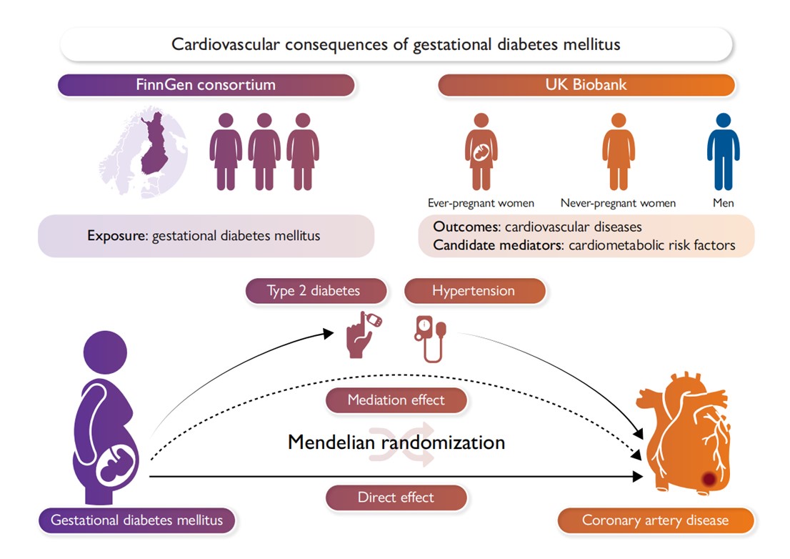 女性心血管疾病是重要的公共健康问题,生育因素作为女性特有的风险因素,与心血管疾病风险升高密切相关。妊娠糖尿病是女性妊娠期最常见的代谢紊乱,全球患病率为1.8%至31%。越来越多研究表明有妊娠糖尿病史女性的心血管疾病风险显著增加,但目前尚不清楚妊娠糖尿病的遗传基础是否会导致女性容易发生心血管疾病。本研究利用英国生物银行(UK Biobank)的性别特异性遗传数据,通过连锁不平衡回归分析确认了妊娠糖尿病与既往妊娠女性心血管事件、冠状动脉疾病、心肌梗死、外周血管疾病之间的遗传正相关性。在孟德尔随机化分析中,发现妊娠糖尿病的遗传易感性与冠状动脉疾病风险之间存在潜在的因果关系,且2型糖尿病和高血压在其中起到了关键的中介作用。重要的是,通过贝叶斯共定位分析和工具变量分层分析,提示妊娠糖尿病的遗传基础有助于女性冠状动脉疾病风险的遗传易感性,而非妊娠糖尿病与冠状动脉疾病共享遗传责任。这一发现为预防和治疗有妊娠糖尿病史女性的心血管疾病提供了新的视角,为通过改变心脏代谢危险因素预防有妊娠糖尿病病史女性未来冠状动脉疾病风险提供了理论依据。