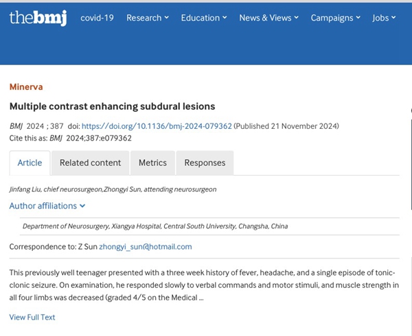 近日,中南大学湘雅医院神经外科颅脑创伤与神经重症专科主任刘劲芳教授团队在国际四大顶级医学期刊之一《The BMJ》(《英国医学杂志》,IF=93.6)以Editorial material(编辑材料)形式发表题为《Multiple contrast enhancing subdural lesions》(颅内多发硬膜下病变)的病例报道。