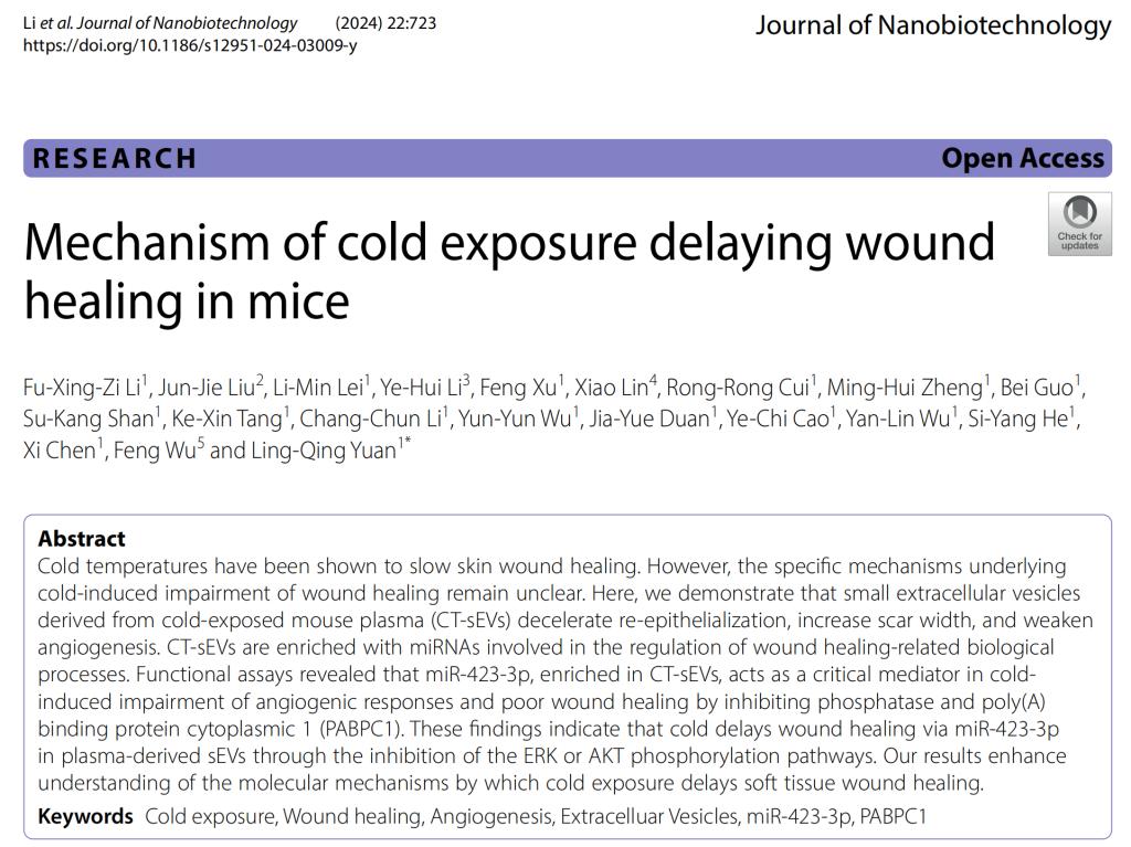 该研究从暴露于寒冷和室温小鼠中分离出血浆来源的sEVs,并评估了这些囊泡的特性。随后发现CT-sEVs会减缓再上皮化过程,增加瘢痕宽度,并削弱血管生成。CT-sEVs富含参与调控与伤口愈合相关生物过程的miRNA。功能实验表明,CT-sEVs中富集的miR-423-3p通过抑制PABPC1,在寒冷诱导的血管生成反应障碍及伤口愈合不良中起关键作用。这些发现表明,CT-sEVs中的miR-423-3p通过抑制ERK或AKT磷酸化通路,延缓了伤口愈合过程。该研究结果加深了对寒冷暴露延缓软组织伤口愈合分子机制的理解。