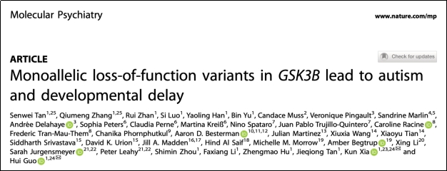 近日,中南大学生命科学学院郭辉教授和夏昆教授(南华大学副校长)在MolPsychiatry在线发表了题为GSK3B基因单倍功能缺失变异导致自闭症和发育迟缓(Monoallelic loss-of-function variants in GSK3B lead to autism and developmental delay)的论文,报道了ASD基因组潜在的非经典剪接变异景观,并进一步定义了一个新的由GSK3B杂合功能缺失型突变导致的分子亚型。该研究证明PSDV在ASD的遗传病因和分子诊断中起重要作用,同时,从临床遗传学的角度证明了导致GSK3B功能缺失的杂合变异可引起以ASD和发育迟缓为核心特征的神经发育障碍。