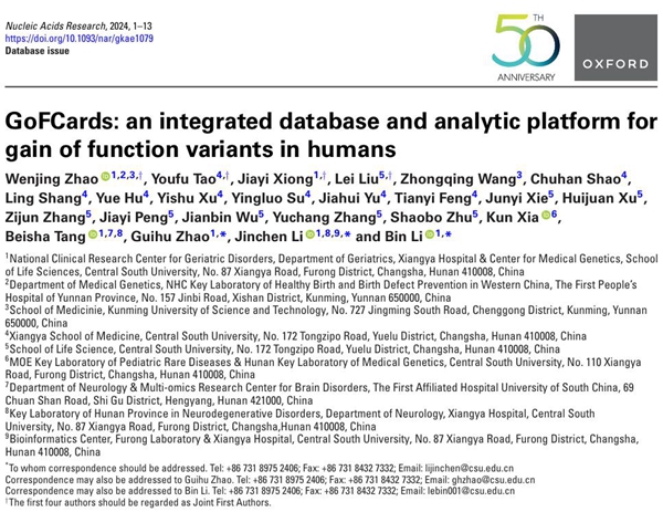 近日,英国牛津大学出版社旗下的生命科学领域权威期刊《Nucleic Acids Research》(IF=16.7)在线发表了中南大学湘雅医院李津臣教授团队最新研究成果《GoFCards: an integrated database and analytic platform for gain of function variants in humans》(GoFCards:人类功能获得性变异数据库和分析平台)。该研究推出了迄今为止最全面的、已获实验验证的人类功能获得性变异相关数据信息,为生物学和医学研究者提供了便捷的查询和分析平台。