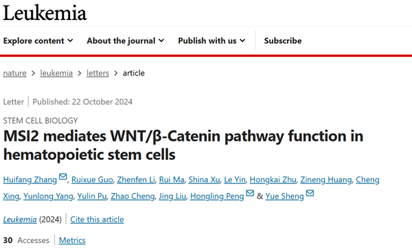 盛岳、彭宏凌团队在国际知名期刊发文揭示MSI2介导WNT/β-Catenin信号通路调控造血干细胞功能